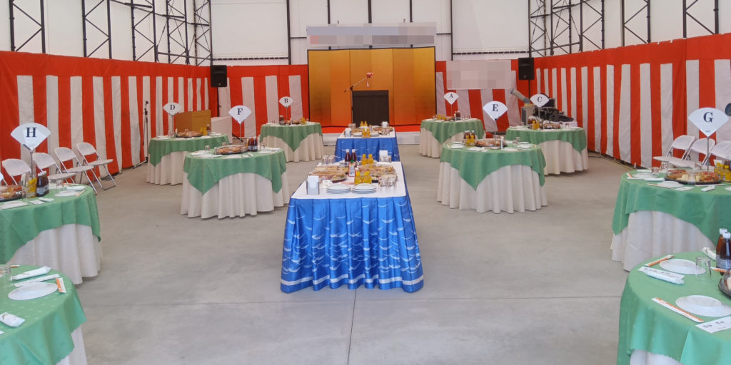 新築のテント倉庫内にて記念祝賀会会場を設営しました。